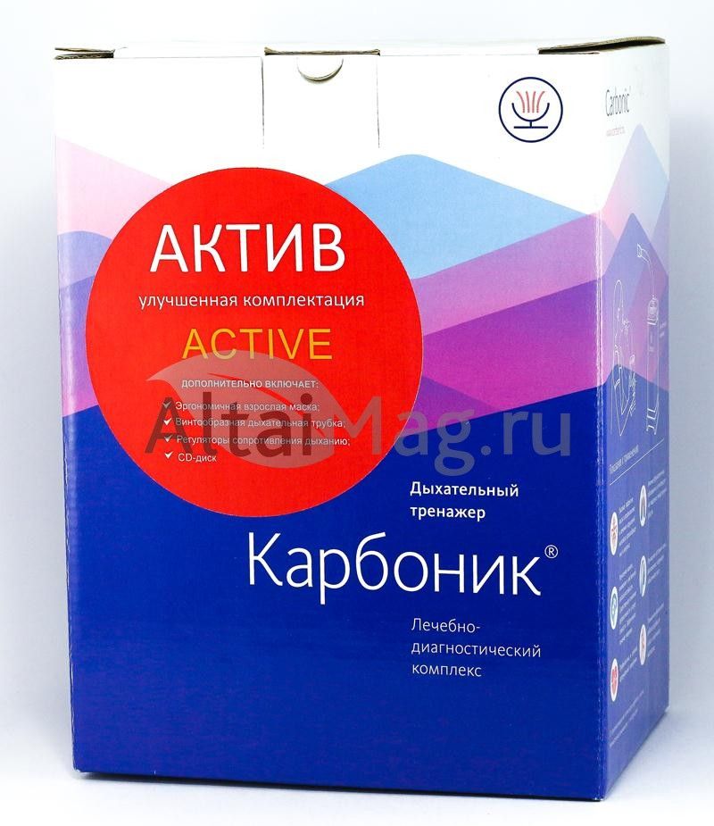 Карбоник актив. Улучшенной комплектации, дополнительно включает, эргономичная маска, винтообразная дыхательная трубка, регуляторы сопротивления дыханию. Уникальный тренажер для дыхательной гимнастики. Для диагностики, лечения, профилактики заболеваний методом гиперкапнической гипоксии.